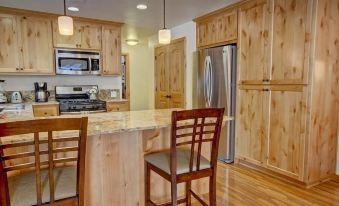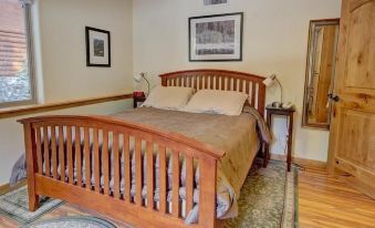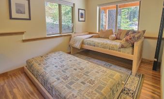 The bedroom features a queen bed with a built-in knotty alder closet. An alcove off the living room provides bedding for up to two additional guests on a daybed and pullout trundle with memory foam mattresses. The trundle is at floor level, so it is great for younger kids, but perhaps not so great for older adults! Alpine Escape is the perfect size for a couple or a family with one or two children. It can work for four adults if the bedding is acceptable, but we don't recommend it for two couples traveling together.