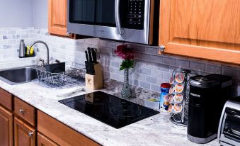 Check-in was fine. Kitchen was fine. Bed and pillows very comfortable. Bathroom has very hot water when you need it. A light fixture above the mirror and sink in the bathroom would be a welcomed addition. Currently, the ceiling light that also has a bluetooth speaker built-in for connecting your music device causes shadows when you are getting ready. You need to step back a few steps from the sink to avoid shadows.