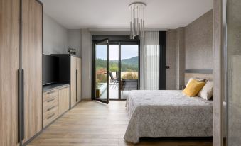 Master bedroom: extra comfortable king bed, Smart TV, en suite bathroom complete with amenities (shampoo, conditioner, gel, towels) and access to private terrace overlooking the landscape.