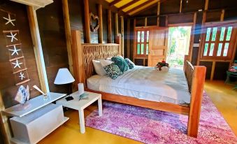 The cottage sleeps 2, additional guests stay at an additional charge. It comes with a fully equipped kitchenette which includes: all necessities for cooking, a fully stocked mini-bar (with a price list), a toaster oven, 2 burner stove, a coffee maker, and a microwave. The cottage has an outdoor patio, king-size bed, A/C, Large smart Tv, Wifi, an outdoor private shower.