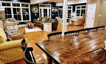 Back in the North Wing, you will find our cavernous country kitchen with a double height ceiling. A large island custom-made of repurposed barnwood comfortably sits eight. Our modern kitchen has two back-to-back Bosch dishwashers, two refrigerators, a stove/oven and a second oven, a microwave, a garbage disposal, a Nespresso Lattissima Pro machine, a Nespresso Vertuo Plus machine, a coffee maker, a coffee grinder, a blender, a popcorn maker, a mixer, a food chopper and all the dishes, glasses, barware and kitchen supplies you may need to host 20 guests for dinner (although we have more than double the dishes to allow for maximum convenience). We even have a restaurant-grade ice machine for those outdoor parties on hot summer days. In the dining room you will entertain all 20 guests around two custom-made farm tables made from glorious repurposed barnwood. We stock the kitchen with a supply of oil, vinegar, spices, coffee and other staple pantry items to get you started.