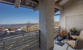 Outside, with access from the kitchen, a gravel garden with deckchairs and an umbrella, a barbecue and a convivial table for 12 people sharing with the other guests of the house; around the apartment an exclusive green area of the apartment overlooking the vineyards and the village of Novello.