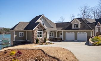This new home has unobstructed big lake views from every room in the house. It comfortably sleeps 12 people and has just been decorated with new furnishings throughout. There are many spaces to hang out and relax; including a sunroom with couch and dining table, two family rooms, two open air porches and chair around the fire pit. Lake activities include a dock with boat slip, with 1 available jet ski lift, shallow water for wading and playing, deep water for fishing and swimming and 2 kayaks with rental. Take out the kayaks a paddle around the beautiful lake. Put out the floating swim dock and have an extra swim to spot.