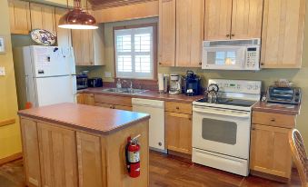 Amenities include a heat generating electric fireplace (off season only), cathedral wood ceiling, central air conditioning/heat, 2 streaming TVs and Starlink satellite internet. The kitchen offers a Keurig K-Cup and standard coffee maker.