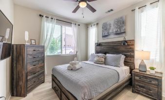 Buat diri Anda nyaman di pondok ber-AC ini, memiliki fitur dapur dengan oven dan microwave.Tersedia 43-inci TV layar datar, dengan program saluran kabel. Kenyamanan meliputi meja tulis dan mesin cuci/pengering.