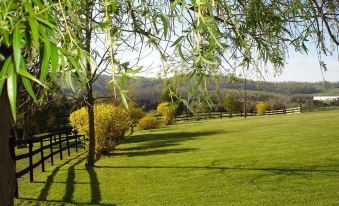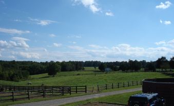 Our guests are always thrilled by the opportunity to enjoy such a large and beautiful pastoral setting. Our entry road is almost a mile long, and you pass ponds, cattle pastures and through cedar-lined sections. At the top of the hill, you find our farm complex, with the Manor House (with this Servants' Cottage snuggled in behind), our bell-roofed barn (former dairy barn), our 1856 bank barn, and other farm buildings. The Pond House and the Milker's Cottage are also within view, as is the training ring for our stables. There is a wonderful fishing pond full of bass and bream, and we supply the fishing equipment. And there are miles and miles of woodland trails, two impressive rope swings, horseshoe pits, views of the mountains, ancient boxwoods, and horses and cows to watch. Our wild residents include geese, turkeys, deer, fox, badgers, racoons, coyotes (sadly), thousands of frogs, and the occasional snake, skunk. and field mouse.