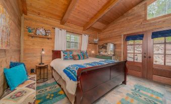 French doors lead out of the back of the cabin, letting you enjoy the views of