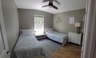There are 2 primary bedrooms featuring king beds with attached private ensuite bathrooms with overhead heaters and walk-in showers. There are also 2 secondary bedrooms -- one with bunk beds and an additional twin bed, the other with two twin beds -- that share a nearby hall bathroom. The oversized dining room table was locally handcrafted using walnut salvaged from the property and is large enough to fit your whole group! The well-equipped, open kitchen features rustic wood cabinets, quartz countertops, full-size appliances, and an extra large sink. The kitchen is fully stocked with everything you’ll need for your visit. Brand-new kitchen gadgets include a large and tiny crock-pot, 2 griddles, 2 waffle makers, coffee maker, 2 muffin trays, cutting boards, pots, pans, knives, outdoor plastic cups/plates and bowls, kid-friendly cups/plates/bowls and utensils, wine and beer glasses, and so much more. The washer and dryer are conveniently located on the main floor.