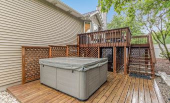 OUTSIDE: Walking off of the upper level, the deck features a grill and seating area, with steps down to a second deck where a beautiful hot tub awaits you! Additional seating at the picnic table and a firepit in a privacy-fenced area fully complement the outdoor space for you to relax and enjoy! The large backyard is also available for use and safe for children away from the street!