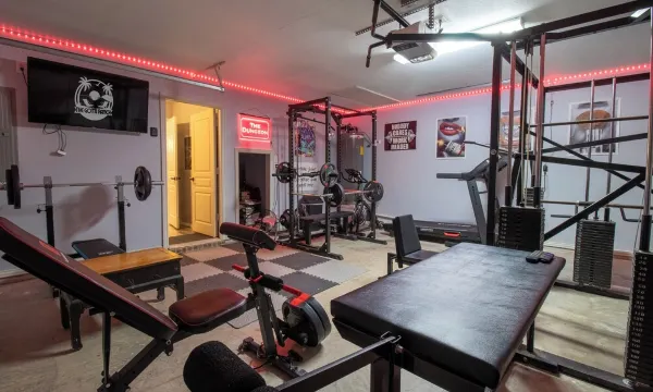 Inside the house you will find 3 bedrooms on the first floor, and 2 full bathrooms. Each room has a TV. There is an office with a futon, as well as a large upstairs movie room with sleeper sofas and futons. A big TV in the living room with surround sound, 3 couches, dining area, and large kitchen with refrigerator, microwave, oven, burners, air fryer, blender, crock pot, toaster, and coffee maker. In the laundry room you will find a new washer and dryer. In the garage there is a full gym with equipment and a TV.