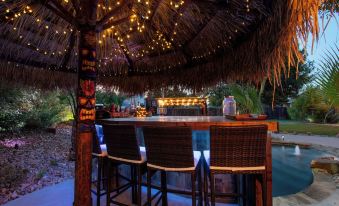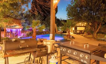 Huge swimming pool with a stone waterfall, water slide, water volleyball, water basketball, pool toys, tanning ledge, two pool lounge chairs for sunbathing, pool lights, palm trees and beautiful landscaping surrounding. A 6 person hot tub with lounger and color changing lights with a TV and firepit nearby. Huge covered patios with ceiling fans and roll down shades to escape the heat. Color changing landscape lighting and string lighting at night. A TIki bar with mini fridge and bar stools by the pool. Dedicated outhouse bathroom by the pool with a sink, urinal, and new toilet. 4 outdoor TVs with all Dish channels. DISH offers more than 330 channels, including local networks, regional and national sports, premium movie channels and more. You may also log into your account on Netflix or Amazon Prime. There are two surround sound systems that you can connect to by Bluetooth. Outdoor Polk Sound Bar has a Front sound bar, 4 rear speakers, and one subwoofer.