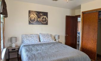 Our sweet, charming home has two bedrooms, queen size beds in both, there is also a futon couch in one of the bedrooms, TV's in both rooms and a 65" tv in the living room. Nightstands with charging stations and lamp. Nice comfy couch with chase in living room and cozy glider rock chair with foot stool. The kitchen table is also arranged cozily in the living room. Also, some boardgames/card games are available.