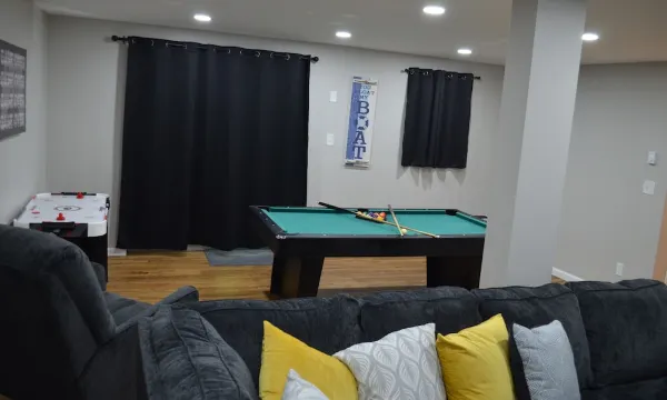 Family Room has a Pool Table and Air Hockey table along with a wood burning fireplace.