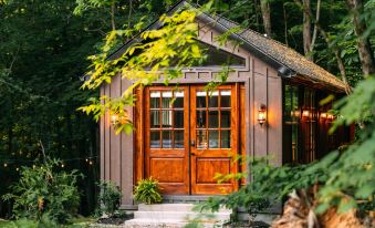 Your queen canopy bed is pure comfort—with soft organic linens, calming tones, and French doors that open to two private decks. Wake up to views of the forest wildlife and slow mornings in bed. There’s also a roomy closet and armoire to keep things tidy, plus little touches like rattan stools for your charging your phone overnight or placing your reading glasses.
