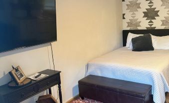 This cabin is pet friendly and features a private fenced in yard with shade and a picnic table. Your furry friend will love sitting on the front porch with you while you enjoy your morning coffee. Spoil him with a walk on the paved pathway in the city park next to the cabins.