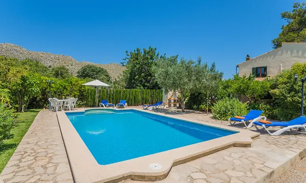 Country house "Cuxach d´en Joan". Outside the resort, 1.7 km from the centre of Pollença, 5 km from the sea, in a cul-de-sac. Private: property 3'500 m2, garden 90 m2 wildlife garden and trees, swimming pool (4 x 8 m, seasonal availability: 15.Mar. - 07.Nov.). WC in the pool area, shower/WC in the pool area, outdoor shower, pergola (24 m2), barbecue, parking at the house. Shop 1.5 km, grocery 1 km, restaurant 1 km, bus stop 1 km, railway station 14 km, sandy beach 5 km pebble beach 5.5 km, rocky beach 7.5 km. Golf course (18 hole) 3.5 km, tennis 1.2 km, riding stable 1.5 km. 5-room house 140 m2. Practical and rustic furnishings: living room with satellite TV. 1 room with 2 beds (90 cm, length 190 cm), air conditioning. Kitchen (4 hot plates, oven, dishwasher, microwave, freezer) with dining table. Bath/bidet/WC. Air-conditioning, forced-air heating. Upper floor: 1 room with 2 beds (90 cm, length 180 cm), air conditioning. 1 room with 1 french bed (135 cm, length 190 cm), air conditioning. 1 room with 1 french bed (150 cm), air conditioning. Bath/bidet/WC. Terrace furniture, barbecue, deck chairs (6), covered balcony. Facilities: washing machine, children's high chair, baby cot for up to 2 year olds. Internet (WiFi). ETV1088 // Reg. Nr.: ESFCTU00000703000032897500000000000000000000ETV/10883