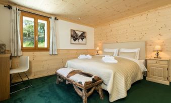 The chalet has 4 bedrooms and comfortably sleeps 10 people. Two bedrooms have luxuriously appointed en suite bathrooms, one room has 2 bunk beds (for a total of 4 people), and the last guest room has a double bed which can be made up as one or as two beds. The bunk bed room and last guest room share a large, well-appointed full bathroom. Direct access to the terrace, featuring a HotSprings Spa hot tub for 5 people, is possible through two of the bedrooms. A sauna with separate shower awaits sports and relaxation enthusiasts alike.