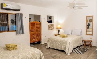 * Master bedroom: two queen beds, ceiling fan, ensuite bathroom, AC