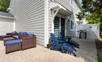 The outside area in front and behind Sandy Shores features tall, beautiful trees, which you can see through many of the inside windows. There’s a simple back stoop and a commonly shared firepit, as well.