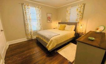 Each cottage features 2 bedrooms and one full bathroom. The newly restored vintage bedroom in the front features a king-sized bed and a work station for travelers that need to work from home. The second bedroom features a queen-sized bed. There is a fully equipped kitchen with all new appliances and staples for cooking. There is also a washer and dryer. Each cottage has its own front porch and its own fenced-in back yard.