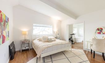 The primary bedroom has a king size bed and access to the main bathroom with a shower and deep bathtub.
