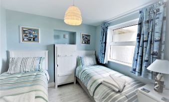 The ground floor contains: A contemporary kitchen/diner with a large bay window and panoramic sea views, TV with DVD player, CD/ radio, and seating for 10/12. A fully fitted kitchen with 2 pyrolytic ovens, hob, 2 dishwashers, microwave, fridge/freezer, washing machine and tumble dryer. Two twin bedrooms with nautical decoration , one of which has an en-suite shower room, the other is next to a cloakroom with a basin and wc.