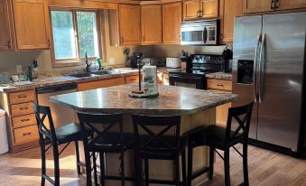 Comfortable, spacious property. Lots of parking. Large private yard with lots of fire pit seating and tables. We enjoyed the great sunset views of the lake. All the beds were very comfortable. Kitchen was well stocked.