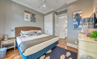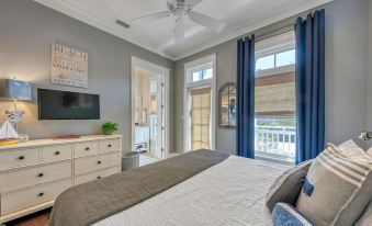 Searenity Now, located in the luscious Carillon Beach gated community on 30A in Panama City Beach, Florida, is steps from one of 3 pools and a 3 to 5-minute walk to the beautiful Gulf of Mexico within the neighborhood. But if walking is not your style, ride in a 2025 six seat golf cart to the walk-over to the beach or around the neighborhood for the week. For relaxation, the 2-story beach themed cottage includes 3 king en-suite bedrooms all with new purple mattresses—one of which is a spacious master and each with seated outdoor space. The smallest master is on the ground level—perfect for grandparents—and opens to the outside. A Graco Pack and Play is available for parents who prefer to leave the crib at home. Bed linens are sanitized—including bedspreads—to the highest standards between each rental. The open living area and ready to use kitchen include a Gas Stove/Oven, Keurig Duo, Instant Pot, Blender, waffle maker, cooking utensils and basic supplies. TV and Cable are available in the living area and each bedroom as well as WI-FI throughout. An electric grill is provided off the main living area on the screened porch, achieving fire inspection requirements. What is really special about this property is that it includes 4 on the beach cushioned chairs with umbrellas from March-October—extra seating is required by the renter. 6 Beach towels are included.