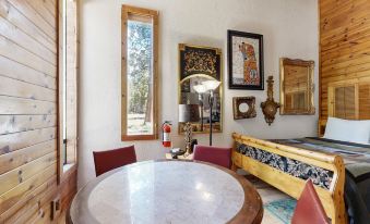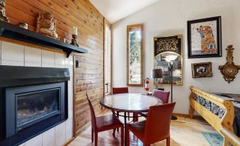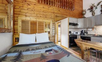 Settle into a mountain cabin unlike any you've seen before! Rich colors, wood paneling, and golden art pieces (including a print of Gustav Klimt's The Kiss) add touches of luxury to a rustic space. Guests can relax at the table around a gas fireplace. It's easy to cook breakfast inside the full kitchen, which also includes a long wooden kitchen island that doubles as a breakfast bar. Enjoy in the living room or take it out to the balcony for some fresh air. When it's time to turn in, guests can rest in the bedroom (complete with privacy blinds), pull out the queen size sofa bed in the living room, or head up to the loft that is luxuriously outfitted with Tiffany-style lamps. Beach towels are provided so that guests can head to the lake as soon as they desire. This retreat will be ready to host the hot cocoa party when everyone returns.