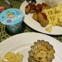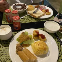 Sarapan prasmanannya termasuk roti panggang ala Barat, roti gulung, telur orak-arik, susu, dan kopi, serta tumisan ala Cina, bubur, dan bakpao—cocok untuk santapan santai.