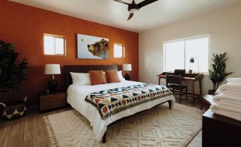 The second bedroom includes a king-sized platform bed with a Helix mattress, bedside tables with reading lights, and a closet. It is decorated with a collection of wood block prints created by a Santa Fe artist and inspired by New Mexico petroglyphs.
