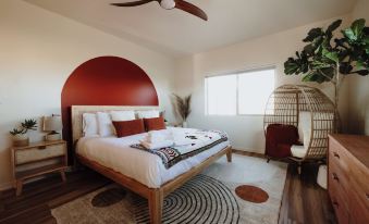 The primary bedroom is furnished with a king-sized bed, a Zinus green tea memory foam mattress and premium linens (an amazing sleep is in your future!). Featuring “Telling Stories” and custom Portola lime wash “El Coyote” paint, the primary bedroom is a relaxing and stylish getaway. Contemporary bedside tables and a matching dresser, reading lights and a full-length mirror ensure the bedroom is fully appointed. One pack n’ play is available for families with kids, including a mattress and sheets.