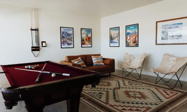 Head down the hallway to the garage and you’ll stumble upon a unique find for Taos VRBOs! Get ready to rack 'em up on the full-size pool table, kick back on the leather couch and cozy butterfly cowhide chairs while you catch the big game on the 65-inch Roku TV, play a game of corn hole, or unwind with some yoga on the mats provided.