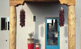 Under the covered front portal, there is an antique wood bench. Enjoy a morning cup of coffee or simply bask in the glory of a perfect waiting spot. Complimentary firewood for the indoor kiva fireplace and outdoor cone fireplace is stacked near the front door.