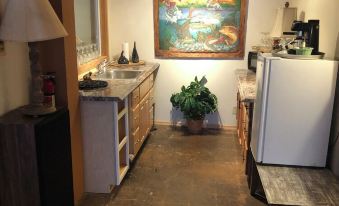 The kitchenette, outfitted with a full-size refrigerator, microwave, and all the essentials, invites you to prepare simple meals or savor a quiet cup of tea. A private patio awaits just outside, a perfect spot to sip your coffee as the world stirs to life or watch the stars wink goodnight.