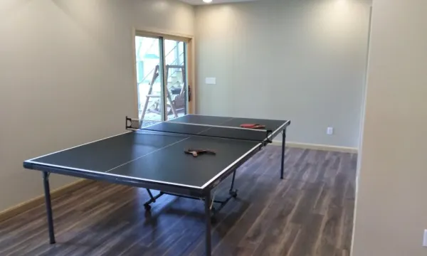 The lower level is the perfect kid's hangout with a pool table, ping-pong table, foosball table, TV area and gas log fireplace.