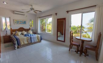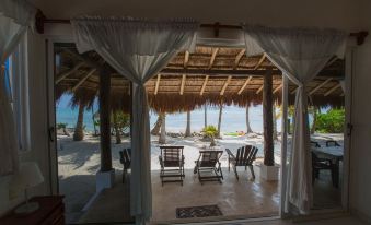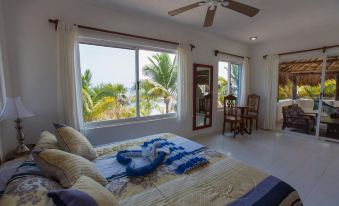 On the main floor are 3 spacious bedrooms and 2 bathrooms. All bedrooms have sliding doors leading out to beachfront covered patios. Upstairs is a huge master suite with a spectacular 180 degree view of the bay. The suite leads out onto a deck with a covered outdoor seating area and hammock. Finally on the roof is an observation deck with a 360 degree view of ocean, beach, mangroves and the sunset.