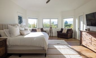 The master bedroom and ensuite are located on the main floor, conveniently adjacent to the main living room, the entertainer's kitchen, and a private office. A laundry room connects the kitchen to the 2-bedroom lock-off suite, providing guests a quieter, self-contained space. This separate area includes its own kitchen, living room, and washer/dryer, perfect for added privacy for some guests during your stay.