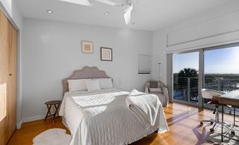 As you walk up the floating stairs to the floating walkways you will notice the magnificent natural light coming into the home. To the right is bedroom #2 is a queen bed tv, closet, and a private sliding glass door to the second floor balcony overlooking the river and the pool.