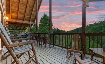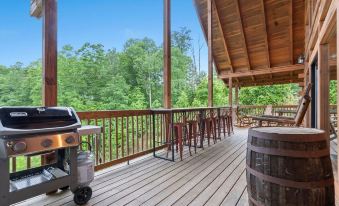 Outdoor amenities include a large deck with picturesque views overlooking a tree lined lake, a covered wrap-around porch, almost daily deer sitings, outdoor dining table, rocking chairs, gas grill, hot tub, and a large fire pit. Parking for 4 standard vehicles onsite. Yard games. Guests have access to the lake and bridge via a private trail, catch-and-release fishing.About pets:No pets allowed.About checkOut:Check out before 11:00 AM.About children:Children allowed: ages 0-17.About customRules:Check In: 4pm