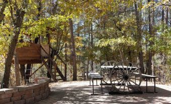Enter the beautiful cedar wood cabin into our spacious family room with a locally sourced stone fireplace and great view of the pines. Then walk through to the kitchen that leads to the expansive deck and treehouse that your kids will play in for hours on end. Past the kitchen features the Main Bedroom with a beautiful natural stone shower spacious enough for two.