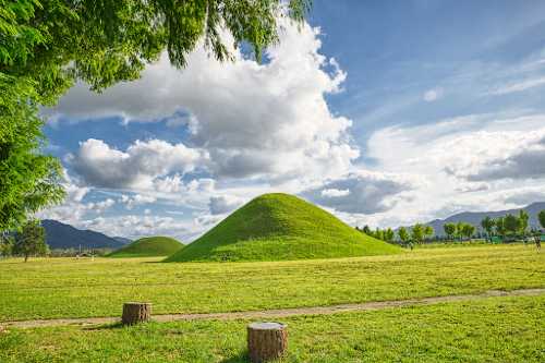Di bawah langit yang megah, Tumuli Hwangnam-dong yang besar di Gyeongju. Betapa indahnya memiliki piknik di tempat yang indah ini yang menyaingi destinasi perjalanan luar negeri?