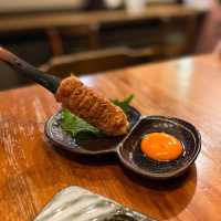 It is only 2 minutes away from Sheung Wan MTR station. There are many types of food and the taste is pretty good😍😍 ▫️Mentaiko Tamagoyaki ($98) There are 6 old old tamagoyaki, the middle of the old old tamagoyaki is filled with mentaiko. The mentaiko is spicy. The tamagoyaki is tender and smooth with rich taste🥰 ▪️Free Chicken Cartilage Stick ($58) I like this one the most. The cartilage sticks are very chewy. They use minced chicken to make the texture very tender and smooth. They are served with soy sauce and eggs. The egg is rich in flavor after being scooped. It is delicious when paired with chicken sticks. ▫️Chicken Skin Shrimp Roll (58) This one is special. It uses chicken skin to wrap the shrimps. There are 2 levels. ▪️Roasted beef and Lingzhi mushroom roll ($48) It's fat beef stuffed mushroom. The sauce is tasty and fragrant. The middle one is Lingzhi mushroom. It's slightly different from the usual golden mushroom. It's a little sweeter. ▫️Pork and Lychee Roll ($42) Pork wrapped in lychee. Lychee is so sweet. Salty and sweet. The taste is quite special. ▪️Jade Squash ($35) There are cherry shrimps on the green melon noodles, which are a bit salty and sweet! ▫️Roasted Chicken Mushroom ($35) The sauce is super good😍 Very tasty ▪️Chicken Skin ($35) The chicken skin is crispy and not greasy🤍 ▫️Chicken Kidney ($34) Super refreshing! Eat a bunch of it and it's enough for me 🫣🫣 ▪️Thick-cut Kurobuta pork belly ($48) Half fat and half lean, the aroma of burnt oil comes out when eaten, and it has a bit of chewiness ▫️Fried Chicken Cartilage ($58) Freshly fried hot and spicy fried noodles ▪️Mentaiko rice balls ($48) The rice balls are baked until golden brown and filled with mentaiko filling, super fragrant! 🏷 Invincible Home G/F, 9 Ma Sha Street, Sheung Wan #Good Christmas Places #Sign Up for Hotel Test Sleeper