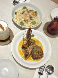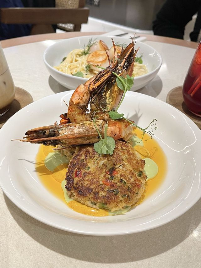 MUTA Restaurant by ATUM is located in the basement of Miramar Shopping Centre in Tsim Sha Tsui, specializing in Western and Japanese light meals🤍 MUTA's decoration is mainly wood, taking the Japanese style of literary youth🇯🇵 warm and comfortable🤤 The restaurant is spacious, with a large number of seats, and there are tatami seats to choose from~✨ 💛Fried shrimp·crab cake·wasabi mayonnaise The prawns are fried fragrantly, and the meat is chewy🍤 The crab cakes are crispy on the outside, with lots of crab meat inside, and they are very delicious when dipped in wasabi mayonnaise! : : : : : : : : : : : : : : :