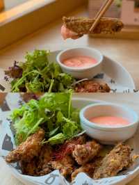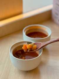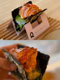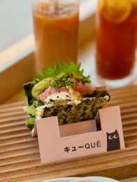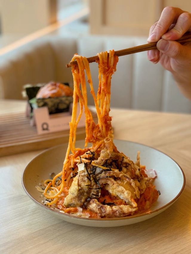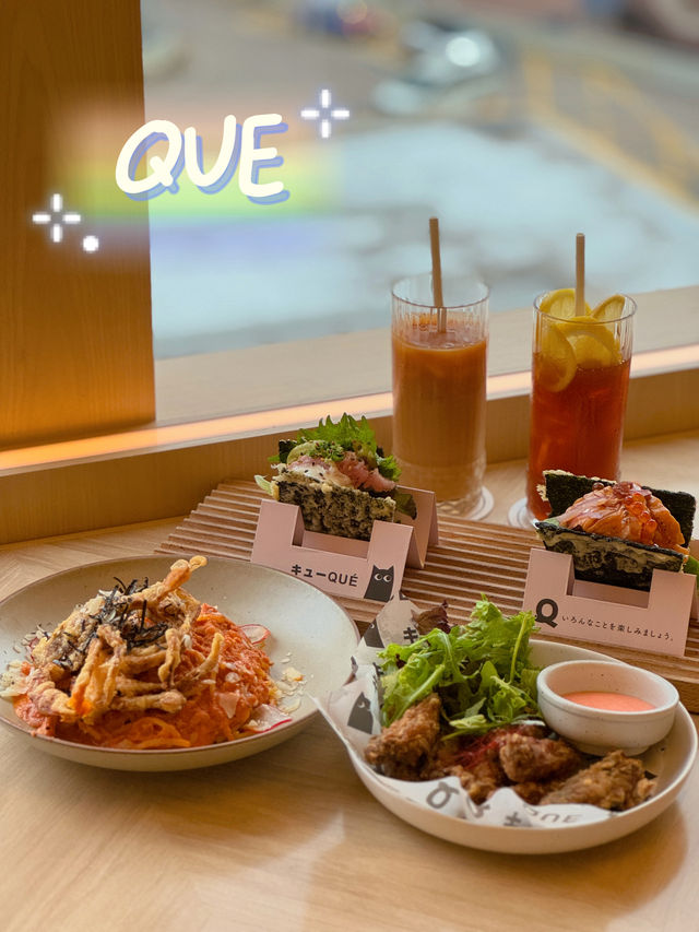 I was walking around Mong Kok East 1990 recently✨ I saw that this restaurant is very well decorated and the environment is quite comfortable, so I went there! I finally had time to eat last week😋 The restaurant adopts Japanese style fresh style☺️ Mainly wood color, feels comfortable 🪵✨ My friend and I just could sit at the booth, very spacious, and have a view to see, happy 💓💓💓 I ordered the set meal for two ($𝟺𝟺𝟾 + 𝟷𝟶%𝚜𝚎𝚛𝚟𝚒𝚌𝚎) 202), including Japanese soup/salad, one snack, one main course, two sushi tacos, one dessert, two drinks 🍹 ❥ It's a Japanese soup The soup is tomato mixed vegetable soup😚 The tomato flavor is very rich🍎 sweet and sour and very appetizing🤤 ❥ Crispy Fried Single Bone Chicken Wings (3 pieces) The outer layer is very crispy, and it's even more flavourful with the mint sauce 🤤 The single-bone chicken wings are very convenient to eat. You can't stop eating them one piece after another! ❥ Soft shell crab pasta with crab tomato cream sauce The pasta is very good, each spaghetti is covered with crab tomato cream sauce, full of fragrance♨️ The portion of soft shell crab is not small🤭 Eat the meat, it’s so crispy‼ ️ This combination is rich and delicious 😋 Recommended 🫶🏼 ❥ Spicy salmon sushi taco This is the signature Japanese-Western cuisine ❤️ a fusion of Japanese sushi and Mexican sushi, very creative 💯 The seaweed is so crispy and tastes great! It's wrapped with grilled salmon, which is very crispy and not too spicy! ❥ Onion Tog Avocado Sauce Sushi Taco I also ordered the onion tortoise, the tortoise tastes fresh, fluffy 🥰 with avocado sauce flavor 🥑 The overall taste is very good! ❥ Matcha Tiramisu Box with Candied Red Beans +$76 Matcha flavor is rich, bitter with a sweet taste🥰 The taste is soft and smooth, the surface is covered with matcha powder, it doesn't feel too greasy💚 ❥ Iced lemon tea ❥ Iced milk tea 📍QUE Shop 453, 4/F, MOKO New Century Plaza, 193 Prince Edward Road West, Mong Kok #HongKongFood #HongKongRestaurantRecommendations #MongKokFood #MongKokRestaurant #MongKokRestaurantRecommendations #JapaneseFood #JapaneseFused #JapaneseWest Restaurant #CreativeCuisine #FoodDiary #HongKongPhoto #PhotoFood #PhotoGoodPlace #CouplesRestaurant #HongKongCouples #FoodPhotography #HongKongFoodStrategy