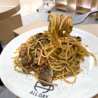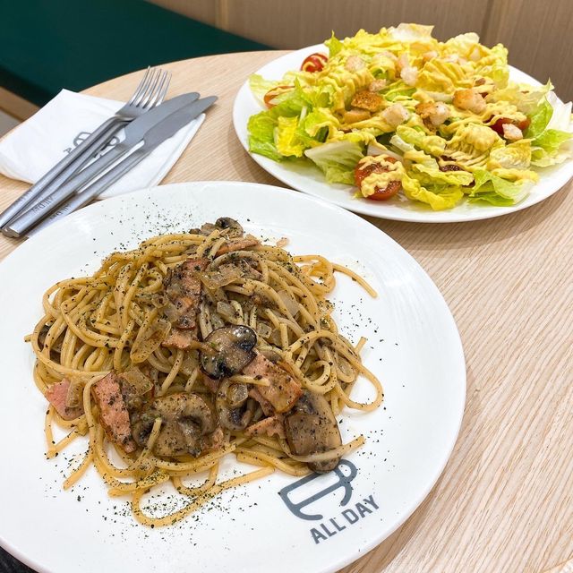 After the renovation of Sheung Shui Plaza, there are many new restaurants. This hipster-style cafe has been opened. The decoration is simple and the menu looks quite attractive 🔸Specialty salad🥗 The portion is quite large, with cherry tomatoes and bread crumbs, most especially its sauce, which is like mustard mayonnaise, the clerk said it was homemade, quite special, and the salad was very fresh and crisp, feeling very fresh! 🔸Spaghetti Carbonara with Truffle Sauce🍝 The pasta was served with a nice truffle flavor, the portion was plenty, the pasta was cooked just right to keep the taste, the ingredients were mushrooms and bacon, quite plentiful! And the truffle sauce is definitely not soft, the pasta and hanging juice, every bite can eat the rich truffle flavor, very good! 🔸Orange flower tea🫖 It looks attractive, colorful, and has a sweet floral aroma 🍴All Day Cafe 📍Shop 503A, 5/F, Sheung Shui Plaza, 39 Long Chom Road, Sheung Shui #foodie #localtour #cafe