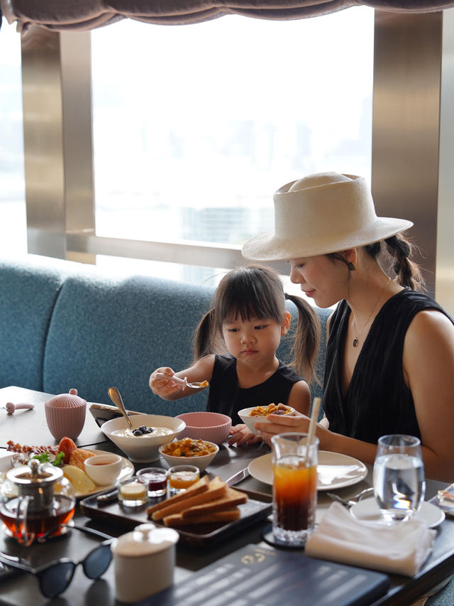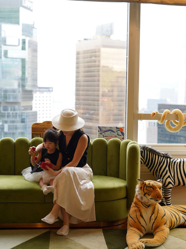 This time I stayed in the Studio 80 Deluxe Room, 78 square meters is simply luxurious in the land-scarce Hong Kong~ The wide panoramic glass windows capture both the cityscape and Victoria Harbour views, truly a "rising journey"✨ The thoughtful details for families with kids are so touching! All cabinet corners are pre-fitted with anti-collision pads, and they even prepared colored pencils, Hong Kong landmark drawing paper, handmade cookies for the kids, and a handwritten card full of warmth. It feels so good to be treated with such care~ The dining experience was amazing! The Mediterranean cuisine at Salisterra on the 49th floor was stunning, the flame show for the salt-grilled sea bass was eye-catching, and the secret sauce was a perfect match. The Continental’s outdoor garden lunch was also great, with a European style surrounded by greenery, and we even came across a Face Painting event, so the kids weren’t bored while eating~ We hardly left the hotel over the weekend: experiencing the "rising feeling" in the atrium on the 38th floor, parent-child reading at the Sky Lounge on the 49th floor, and later visiting the Bimbo Concept playroom. The three themed spaces are so rich in content, the pretend play area kept my daughter from wanting to leave, and the sustainable wooden toys are stunning in appearance! The parent-child photo taken in the bathroom during the twilight blue hour is my favorite picture of the first half of the year~ This place is not just a residence, but a beautiful memory etched in my heart! #KidFriendlyParadise