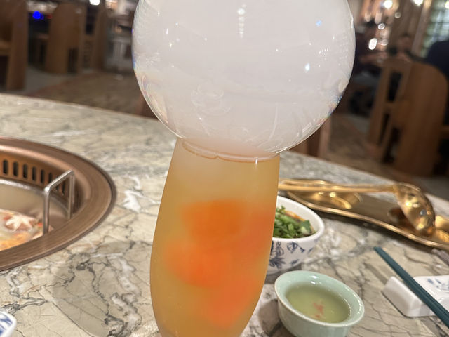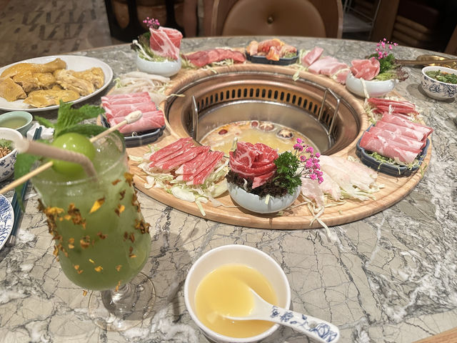 Today I came to Heung Kong Flower Moon in Tsuen Wan with friends. After 8:30 PM, there’s a 40% discount on the entire bill, which I think is quite a good deal. When we entered, we saw the restaurant was very beautiful, and the waitstaff were very nice. We chose the Beauty Fish Maw Chicken Pot, which comes with a plate of fish maw and half a chicken. We started by drinking the chicken soup, which was very clear and sweet. I drank two bowls in one day, and the chicken was also very tasty. We ordered the Flower Moon Platter, which includes Angus beef, black pork, lamb rolls, and Sanhuang chicken tripe. This platter looked great and had a large portion. The beef was very delicious and fresh, and the pork cheek was also very tasty 😆 Most importantly, it’s perfect for taking photos. We also ordered two special drinks: one was Passion Code, and the other was Wild Hunter. The Passion Code had a big bubble on top that you had to blow, making it great for photos, and the drink itself was very tasty. The Wild Hunter was made with avocado, mint, and grapes, giving it a very fresh taste that paired well with the hot pot.