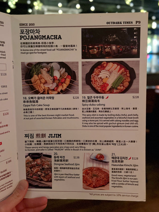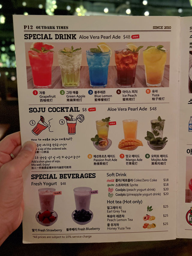 This Korean restaurant has a notable background, originating from a fried chicken brand in Busan, South Korea. It specializes in authentic Korean cuisine. The interior is spacious and comfortable, adorned with a romantic atmosphere featuring love locks hanging on wire mesh and star-shaped pendant lights on the ceiling. 🔸 Skewered Fish Cake Soup - $228 Served on a hot stove to maintain its temperature, the clear and light broth is incredibly flavorful. It includes skewered fish cakes, fish paste, and chikuwa, which are tender, bouncy, and absorb the broth well. Additional ingredients include translucent glass noodles, crisp and tender Chinese lettuce, sweet and soft white radish, enoki mushrooms, and wood ear mushrooms. You can also dip them in Korean-style sauce for extra flavor. 🔸 Grilled Pork Neck (Korean Seasoning) - $198 The thick slices of pork neck are particularly satisfying, with the right amount of fat and connective tissue. The meat is tender and delicate, infused with a rich soy sauce aroma, and accompanied by enoki mushrooms, onions, and chili peppers. 🔸 Blueberry Yogurt - $48 🔸 Strawberry Yogurt - $48 The yogurt is smooth and creamy, with a rich, tangy flavor and a strong fruity taste. You can also add silky fresh cream for an extra touch. ------------------------- Outdark (Faita Commercial Center) Address: 2/F, Faita Commercial Center, 613 Nathan Road, Mong Kok