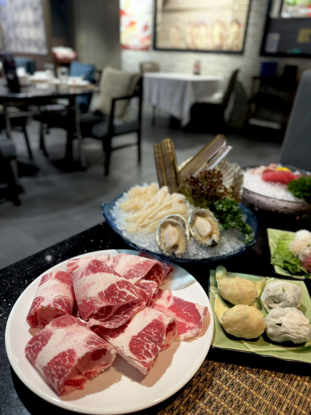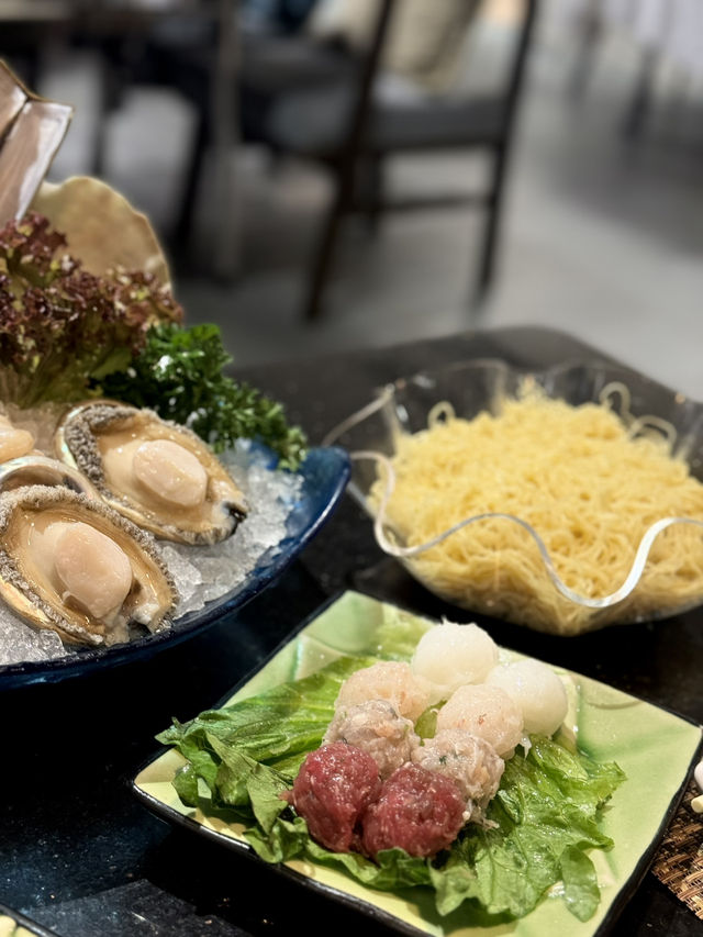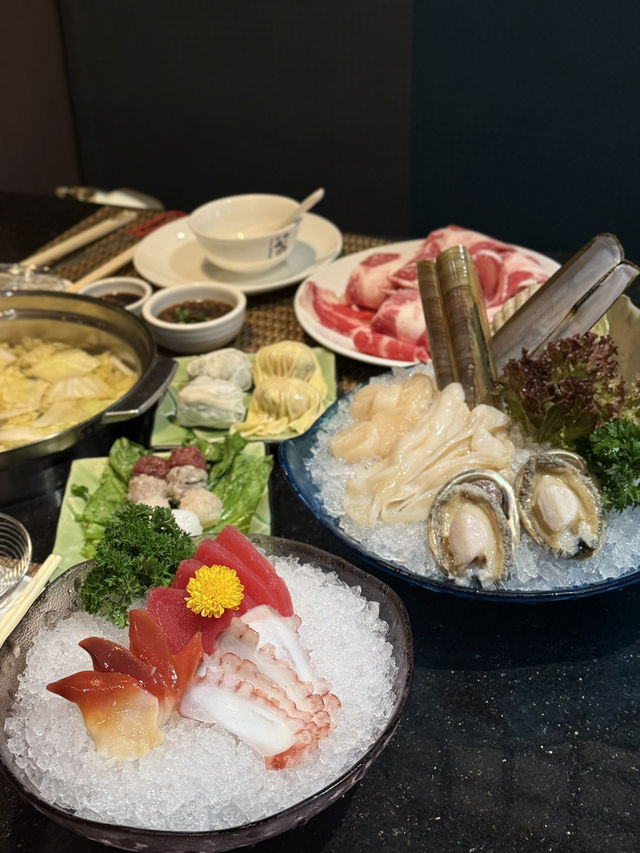 Last night, we tried the Premium Hot Pot set for two, priced at $380 per person, and overall, it was quite impressive. First, the Japanese sashimi platter included surf clams, tuna, and eightband butterflyfish, all of which tasted great! The seafood selection was unbeatable! We chose fresh South African abalone, New Zealand razor clams, and Japanese scallops. The abalone was tender and flavorful; the razor clams were plump and sweet; the scallops were large, fresh, and juicy. All three types of seafood were incredibly fresh with no fishy smell—definitely worth praising! The premium marbled beef had evenly distributed fat, and just a few seconds in the broth made it ready to eat. It was rich in flavor. The clear tofu soup base was sweet and complemented the freshness of the seafood and beef. The tofu was silky and quite enjoyable. The signature dumplings and chive dumplings were packed with filling. The handmade four treasure meatballs were a delightful surprise, each with its unique texture and bouncy bite. Finally, there were tang lettuce and fresh noodles to round off the meal. 📍 Notable Hot Pot Cuisine 2/F, Sun Po Plaza, 23-29 Jordan Road, Jordan